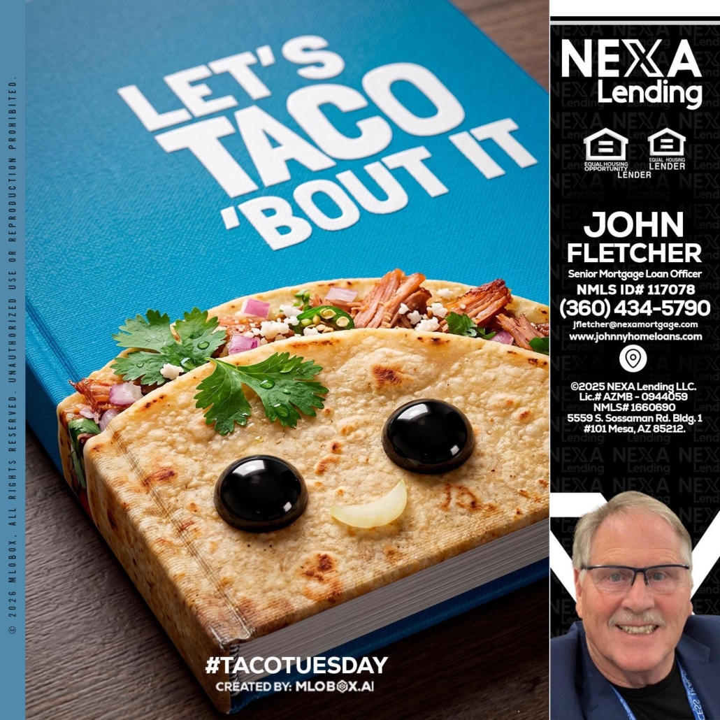 LETS TACO ABOUT IT - John Fletcher -Senior Mortgage Loan OfficerHi, my name is John Fletcher. I’m a Loan Officer with NEXA Lending LLC., offering personalized mortgage solutions, fast customized quotes, great rates and service with integrity.