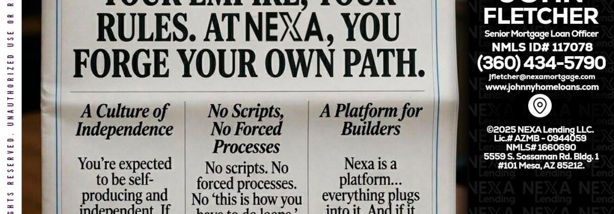Hi, my name is John Fletcher. I’m a Loan Officer with NEXA Lending LLC., offering personalized mortgage solutions, fast customized quotes, great rates and service with integrity.