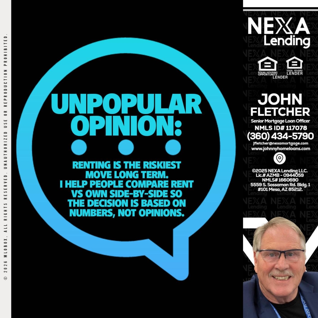 unpopular opinion - John Fletcher -Senior Mortgage Loan OfficerHi, my name is John Fletcher. I’m a Loan Officer with NEXA Lending LLC., offering personalized mortgage solutions, fast customized quotes, great rates and service with integrity.